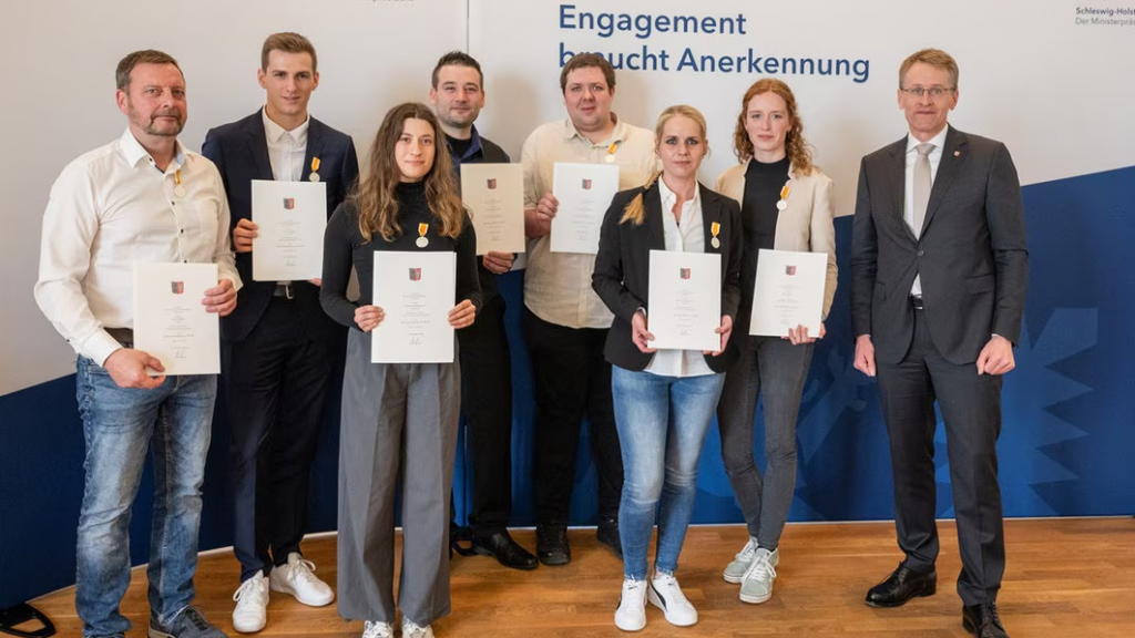 Trotz der Gefahr handelten einige Mitreisende beherzt und selbstlos. Sie leisteten Erste Hilfe, kümmerten sich um die Verletzten und trugen maßgeblich dazu bei, dass der Täter überwältigt werden konnte. Für diesen mutigen Einsatz hat Ministerpräsident Daniel Günther (CDU) am 8. April 2025 acht dieser Helferinnen und Helfer mit der Rettungsmedaille am Bande des Landes Schleswig-Holstein ausgezeichnet.