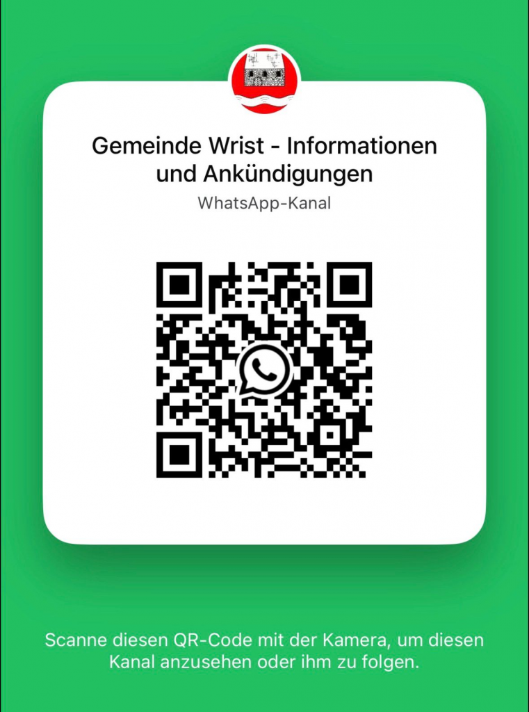 Ab sofort bietet die Gemeinde Wrist einen offiziellen WhatsApp-Kanal an. Über diesen Kanal erhalten Sie künftig wichtige Mitteilungen, Hinweise zu Veranstaltungen sowie aktuelle Informationen direkt auf Ihr Smartphone – einfach, schnell und unkompliziert.